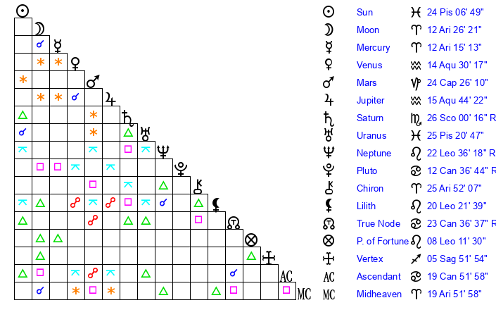 | Saturn | 26 Scorpio 30 | 22 Pisces 23 | 20 Scorpio 45 |