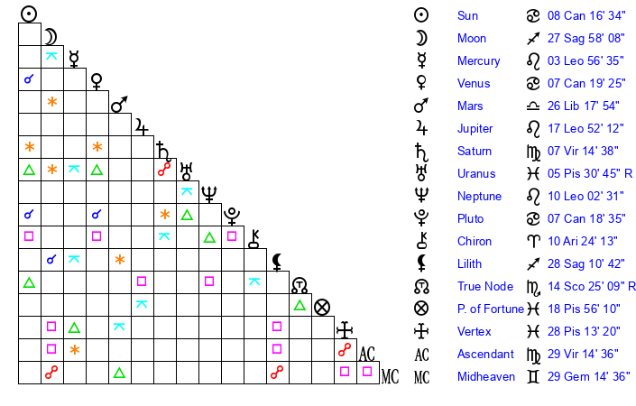 Sun | 8 Cancer 16 | 8 Cancer 52 | 19 Libra 46 |