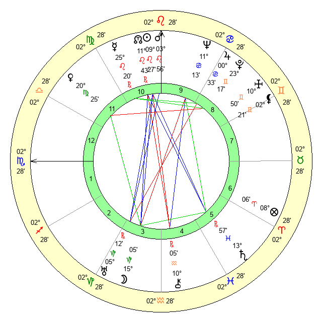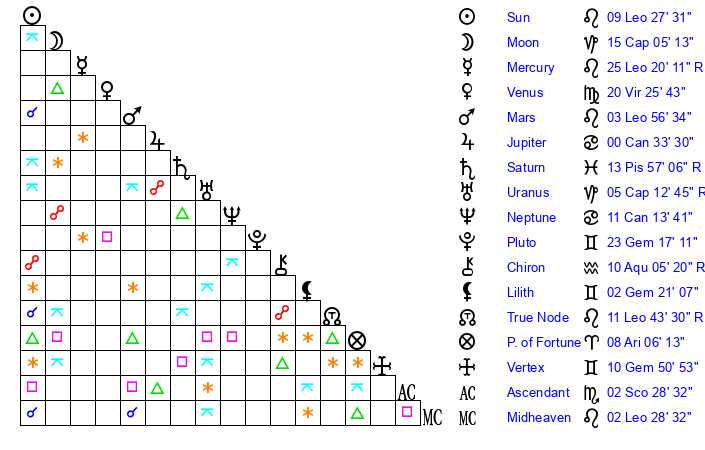 | Sun | 9 Leo 28 | 10 Leo 39 | 6 Sagittarius 35 |