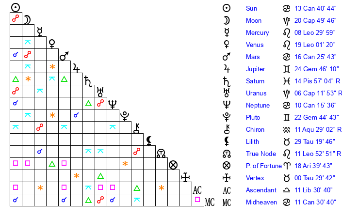 | Neptune | 10 Cancer 16 | 2 Aries 10 | 12 Cancer 35 |