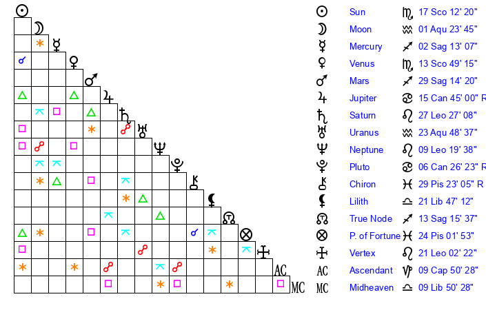 Moon | 1 Aquarius 23 | 3 Pisces 33 | 19 Sagittarius 27 |