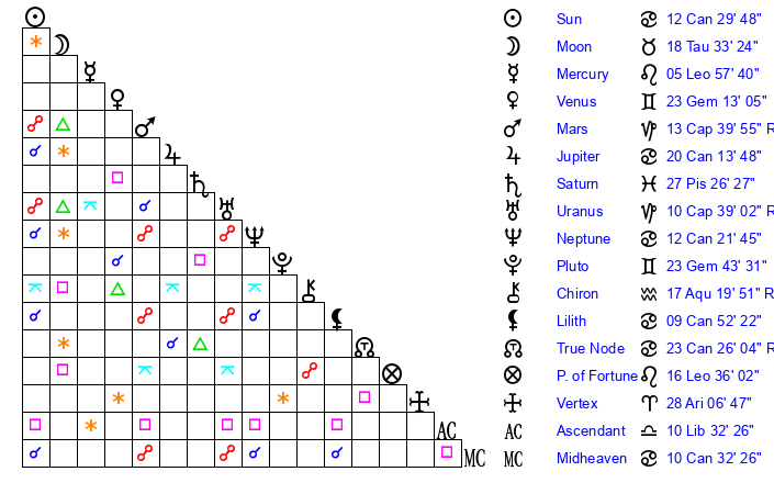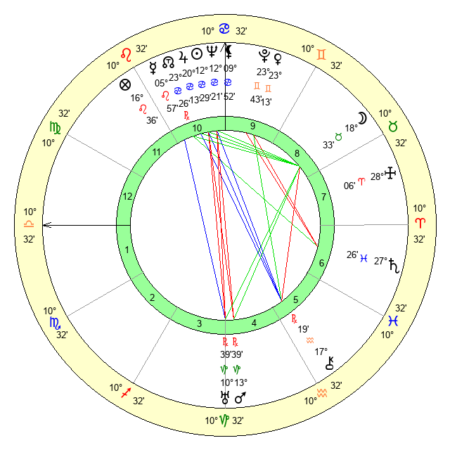 | Sun | 12 Cancer 30 | 13 Cancer 55 | 7 Scorpio 8 |