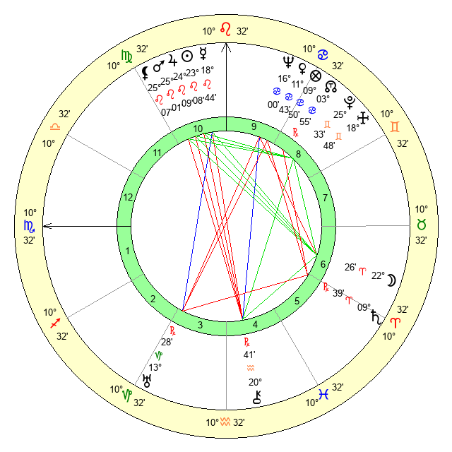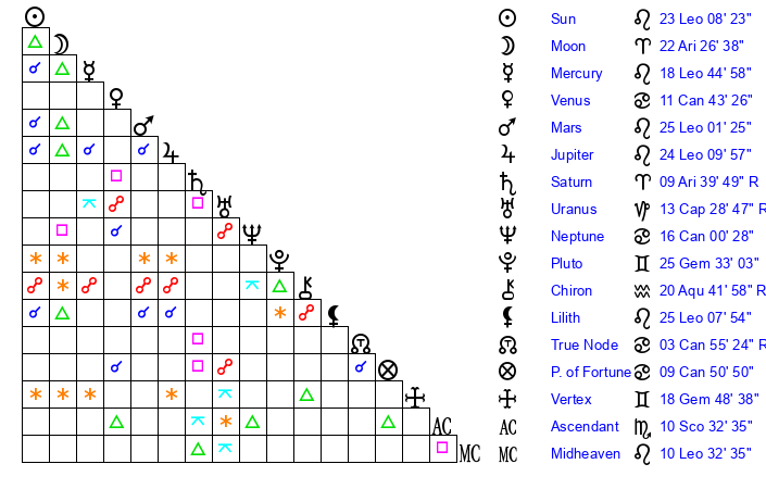 | Mercury | 18 Leo 46 | 5 Leo 48 | 11 Sagittarius 59 |