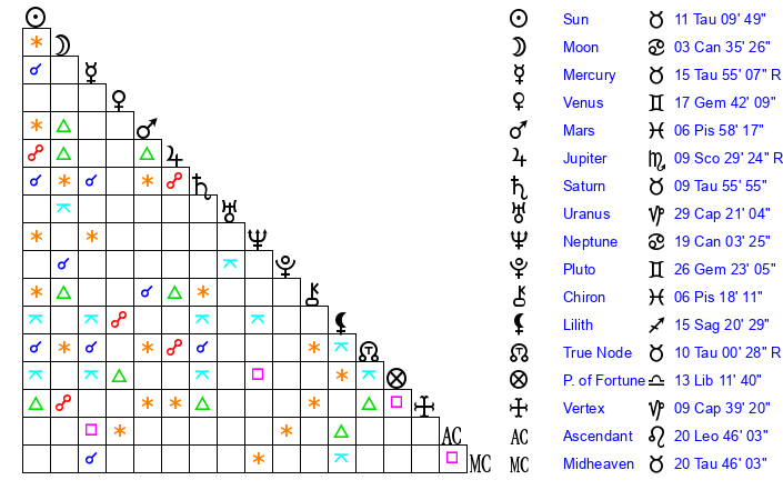 | Saturn | 10 Taurus 28 | 27 Pisces 56 | 20 Taurus 45 |
