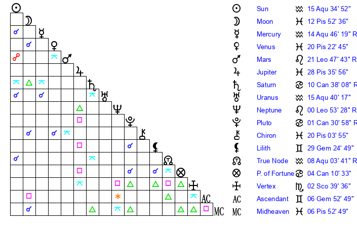 | Moon | 12 Pisces 53 | 22 Taurus 2 | 9 Pisces 21 |