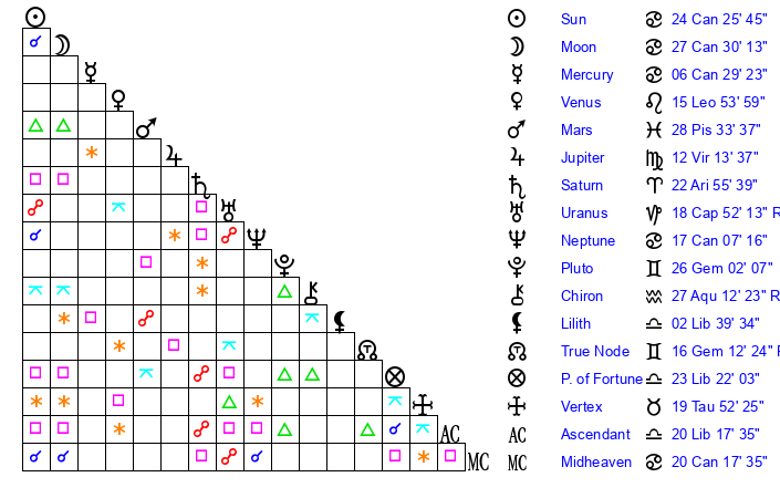 | Moon | 27 Cancer 23 | 21 Aries 6 | 21 Libra 36 |