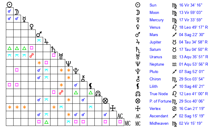 | Sun | 16 Virgo 34 | 17 Virgo 16 | 12 Libra 1 |