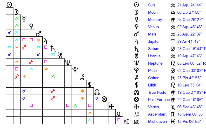 | Sun | 21 Aquarius 24 | 22 Aquarius 12 | 7 Gemini 43 |