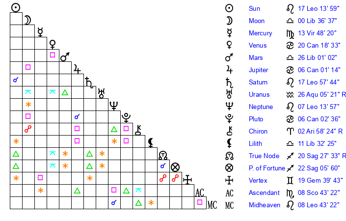 Sun | 17 Leo 13 | 18 Leo 19 | 2 Sagittarius 37 |