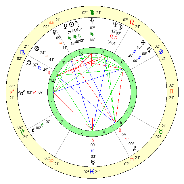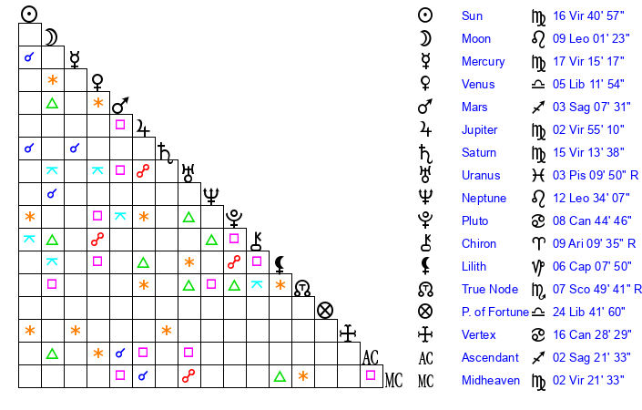 Sun | 16 Virgo 41 | 17 Virgo 16 | 1 Capricorn 36 |