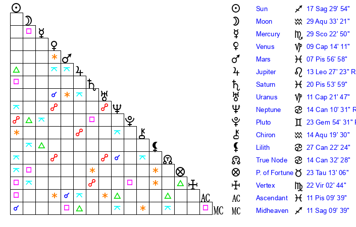 | Pluto | 23 Gemini 54 | 0 Aquarius 27 | 22 Gemini 56 |