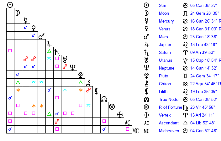 | Venus | 18 Cancer 31 | 22 Taurus 25 | 16 Virgo 17 |