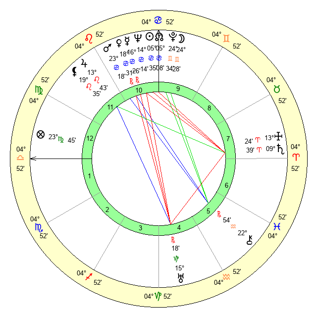 | Sun | 5 Cancer 36 | 6 Cancer 18 | 28 Libra 54 |