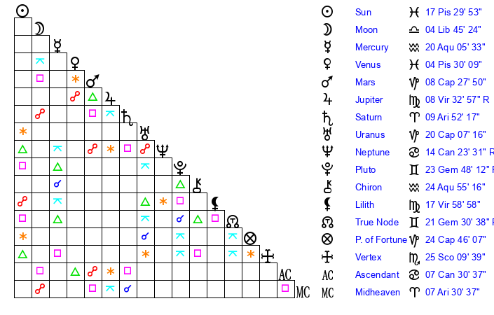 | Sun | 17 Pisces 30 | 18 Pisces 22 | 10 Cancer 8 |