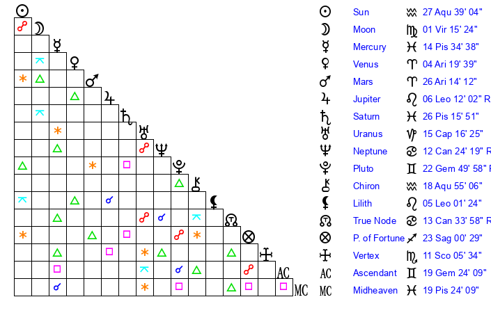 | Sun | 27 Aquarius 39 | 29 Aquarius 17 | 22 Gemini 14 |