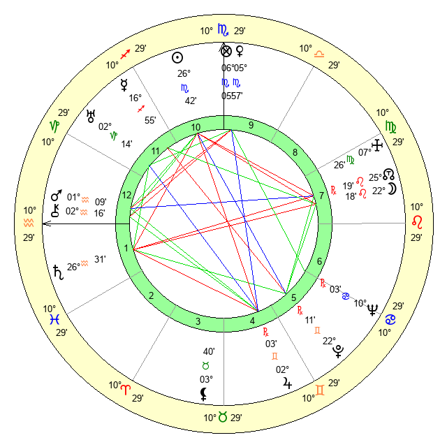 | Moon | 22 Leo 17 | 18 Cancer 29 | 12 Capricorn 38 |