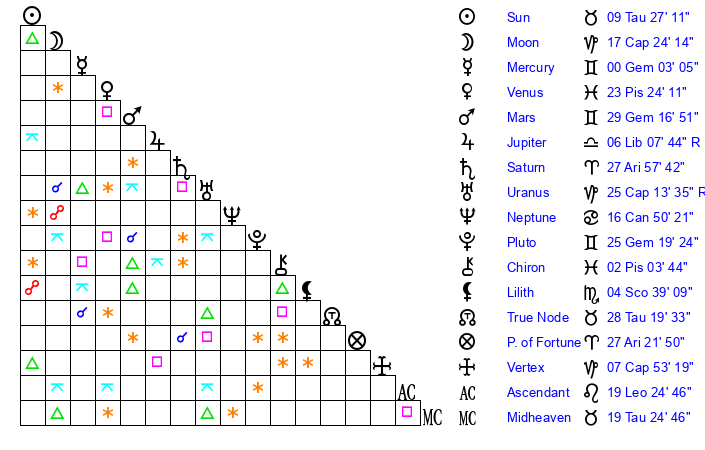 | Moon | 17 Capricorn 16 | 21 Gemini 21 | 7 Aries 48 |