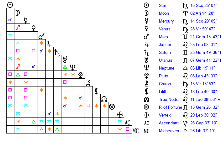 | Sun | 15 Scorpio 25 | 16 Scorpio 32 | 8 Aquarius 41 |