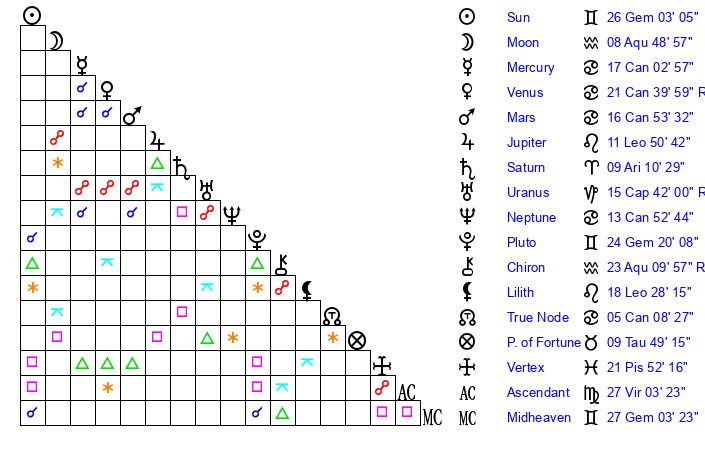 | Pluto | 24 Gemini 20 | 3 Aquarius 23 | 25 Gemini 48 |