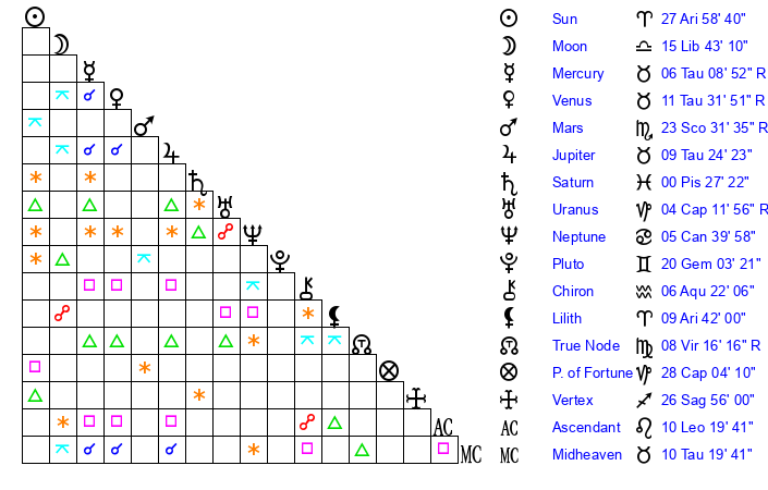 | Moon | 15 Libra 53 | 1 Capricorn 18 | 10 Pisces 57 |