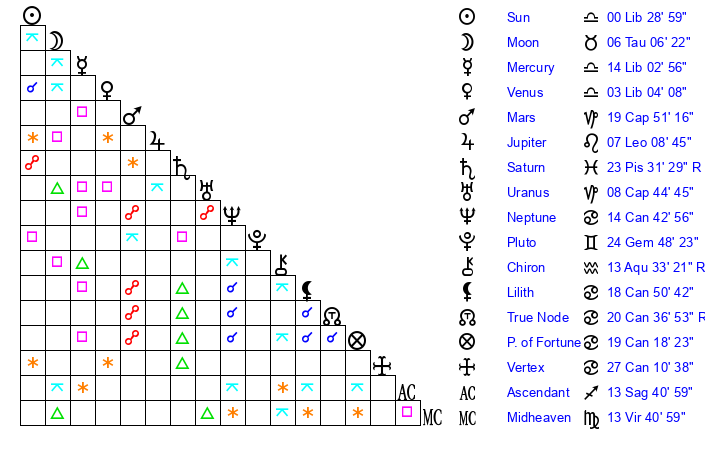 | Mercury | 14 Libra 4 | 10 Libra 54 | 3 Aquarius 23 |