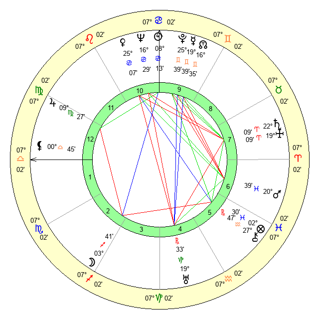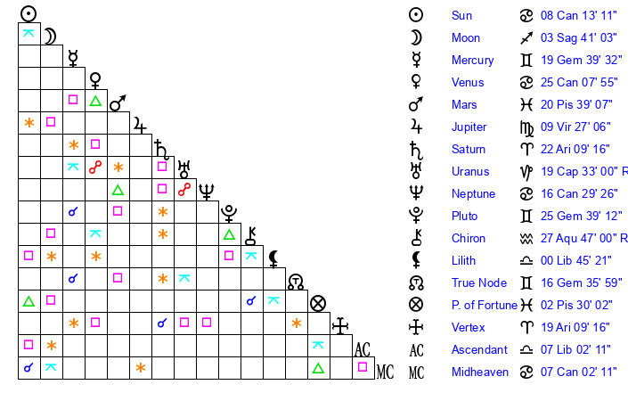 | Sun | 8 Cancer 13 | 9 Cancer 9 | 0 Scorpio 39 |