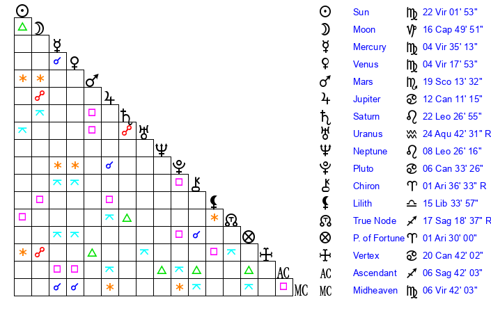 Sun | 22 Virgo 1 | 23 Virgo 6 | 9 Capricorn 13 |