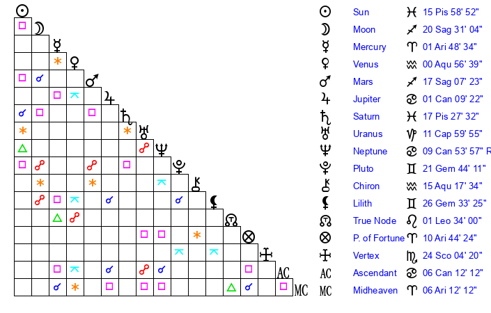 | Sun | 15 Pisces 59 | 17 Pisces 22 | 10 Cancer 36 |