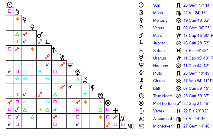 | Sun | 26 Gemini 17 | 27 Gemini 42 | 20 Libra 12 |