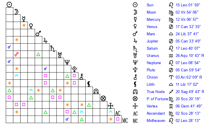 Sun | 15 Leo 1 | 16 Leo 7 | 0 Sagittarius 18 |