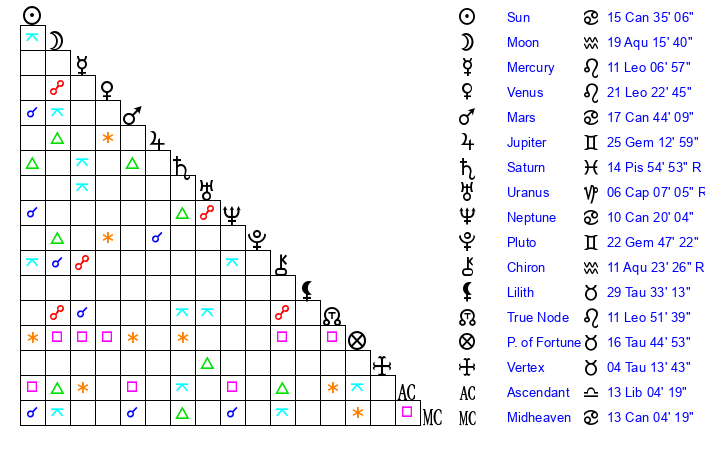 | Moon | 19 Aquarius 15 | 21 Sagittarius 46 | 19 Gemini 51 |