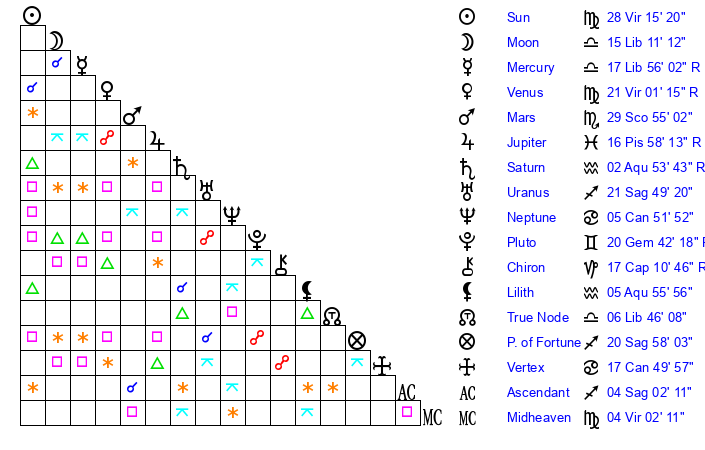| Venus | 21 Virgo 0 | 3 Virgo 35 | 20 Sagittarius 29 |