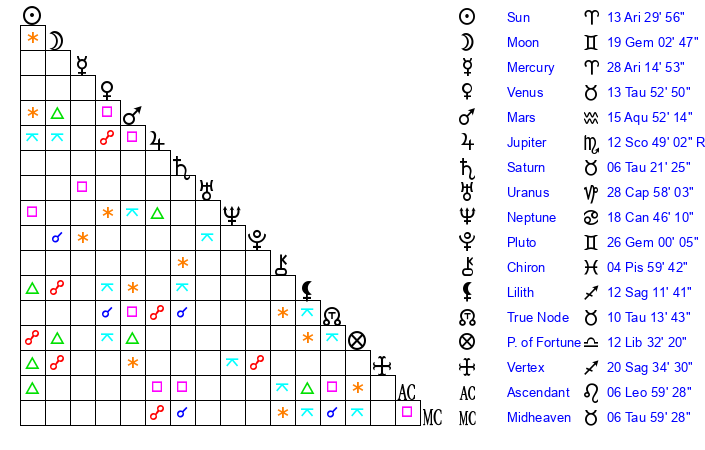 | Sun | 13 Aries 30 | 14 Aries 52 | 3 Leo 13 |