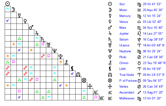 | Neptune | 6 Virgo 26 | 0 Aries 44 | 7 Virgo 55 |