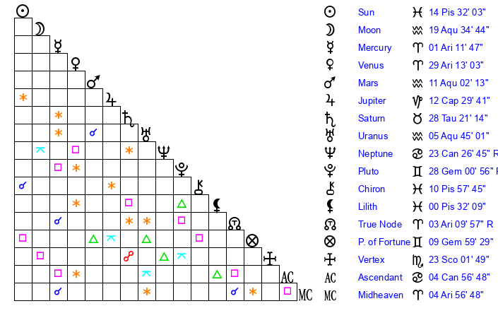 | Sun | 14 Pisces 32 | 15 Pisces 22 | 3 Cancer 29 |