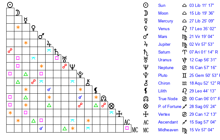 | Mercury | 27 Libra 25 | 14 Libra 14 | 18 Aquarius 10 |