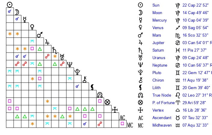 | Sun | 22 Capricorn 23 | 23 Capricorn 46 | 19 Taurus 50 |