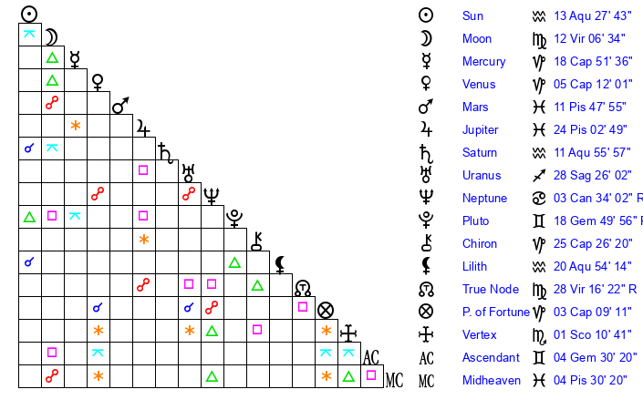 | Sun | 13 Aquarius 28 | 15 Aquarius 7 | 12 Gemini 39 |