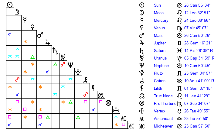 | Sun | 28 Cancer 57 | 0 Leo 8 | 25 Scorpio 28 |