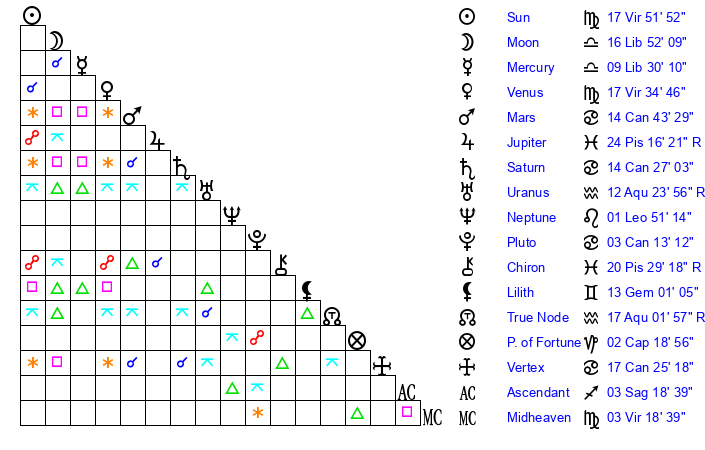 | Sun | 17 Virgo 51 | 19 Virgo 12 | 7 Capricorn 56 |
