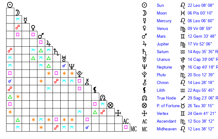 | Sun | 22 Leo 8 | 22 Leo 9 | 24 Virgo 4 |