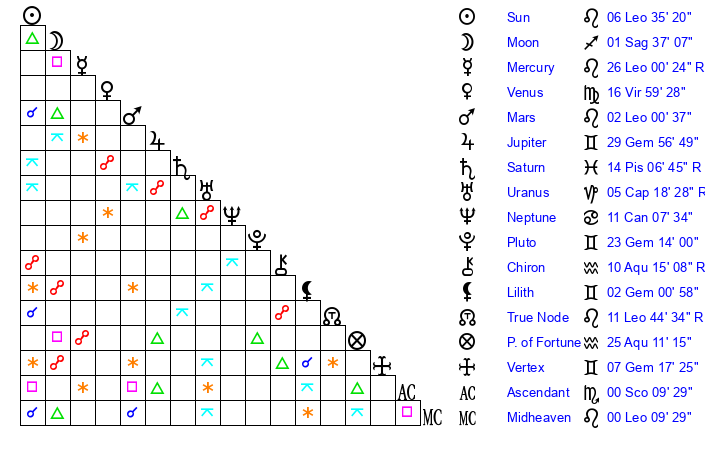 | Sun | 6 Leo 35 | 7 Leo 47 | 3 Sagittarius 33 |