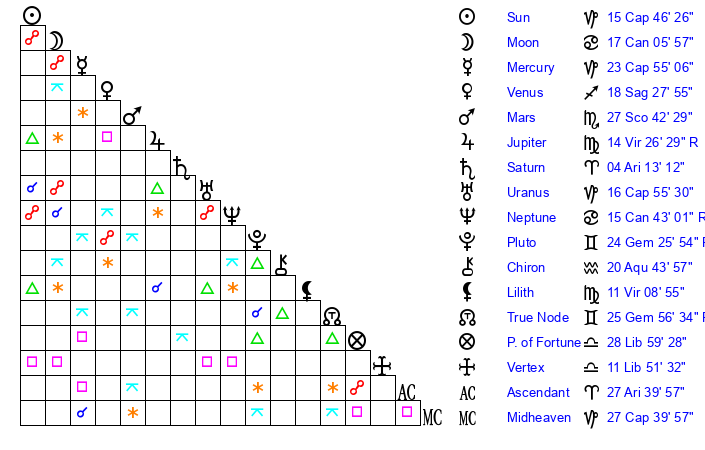 | Mars | 27 Scorpio 43 | 29 Cancer 54 | 15 Aquarius 8 |
