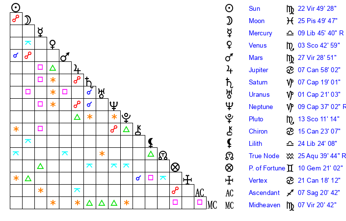 | Sun | 22 Virgo 49 | 23 Virgo 6 | 28 Libra 16 |