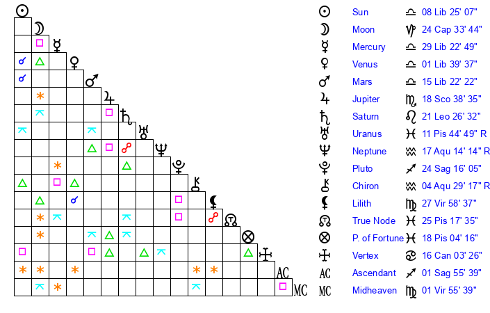 Moon | 24 Capricorn 32 | 28 Capricorn 59 | 11 Libra 12 |