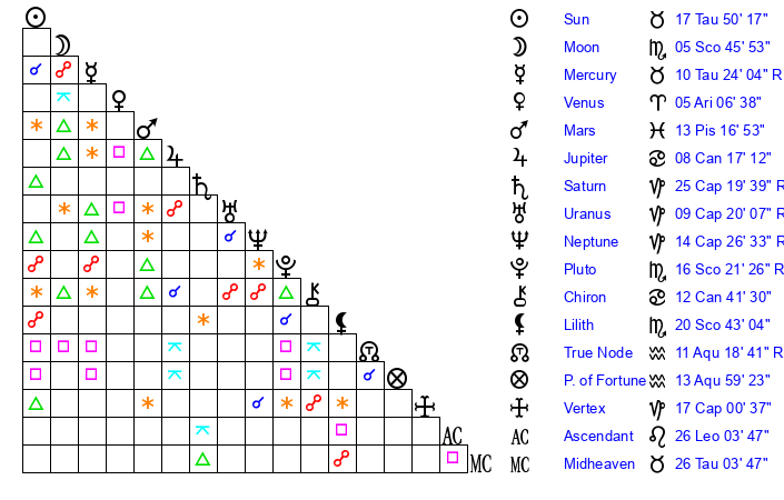 Moon | 5 Scorpio 40 | 4 Libra 51 | 9 Aquarius 16 |