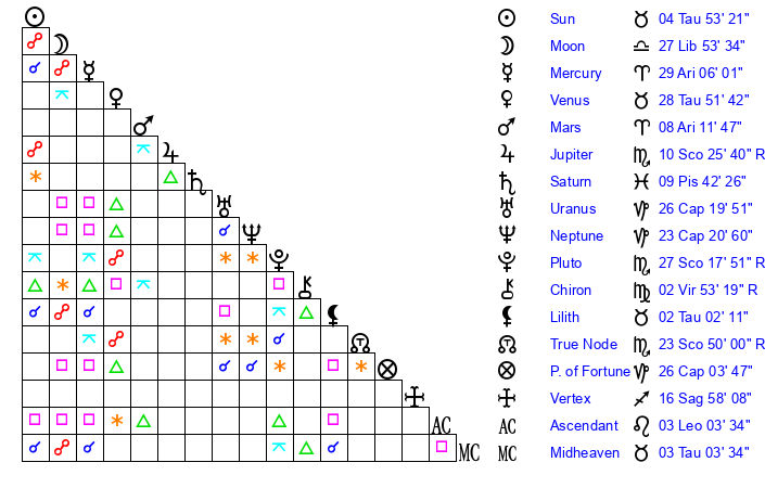 Sun | 4 Taurus 53 | 5 Taurus 22 | 4 Gemini 51 |