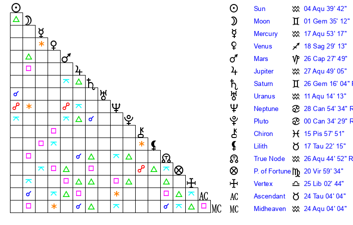 | Uranus | 11 Aquarius 12 | 23 Taurus 17 | 15 Aquarius 36 |
