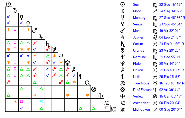 Neptune | 21 Scorpio 55 | 27 Pisces 16 | 23 Scorpio 49 |