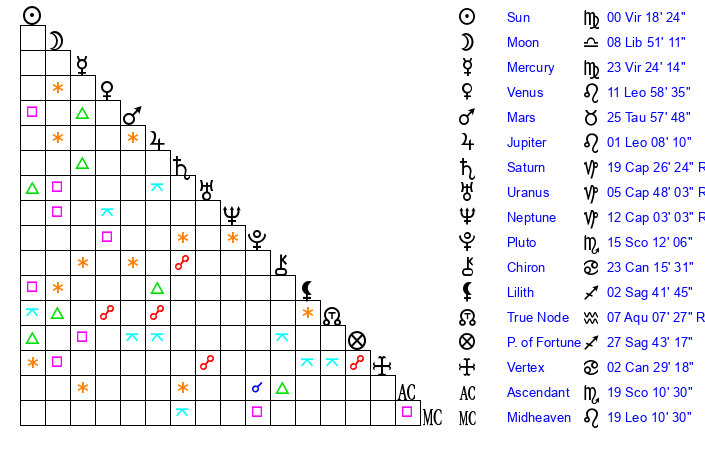 | Mercury | 23 Virgo 23 | 13 Leo 10 | 17 Virgo 13 |